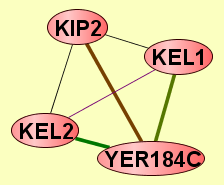 | View GO Analysis | 4 proteins | From the published set of core protein complex predictions. | KEL1 KEL2 KIP2 YER184C |