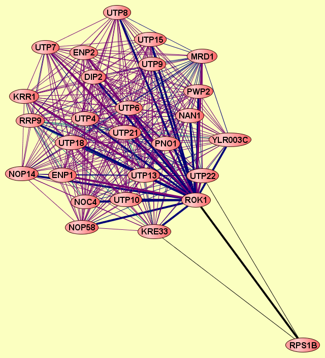 | View GO Analysis | 20 proteins | From the published set of protein complexes (core proteins only) | CMS1 DIP2 MRD1 NAN1 NOP58 PNO1 PWP2 ROK1 RRP9 UTP10 UTP13 UTP15 UTP18 UTP21 UTP22 UTP4 UTP6 UTP7 UTP8 UTP9 |