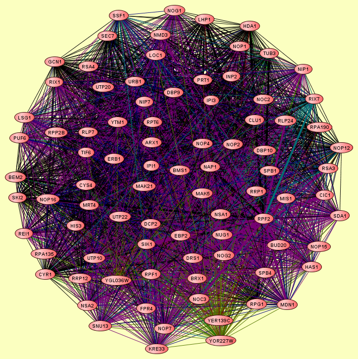 | View GO Analysis | 86 proteins | From the published set of protein complexes. | ARX1 BEM2 BMS1 BRX1 BUD20 CIC1 CLU1 CYR1 CYS4 DBP10 DBP9 DCP2 DRS1 EBP2 ERB1 FPR4 GCN1 HAS1 HDA1 HER1 HIS3 INP2 IPI1 IPI3 KRE33 LHP1 LOC1 LSG1 MAK21 MAK5 MDN1 MIS1 MRT4 NAP1 NIP1 NIP7 NMD3 NOC2 NOC3 NOG1 NOG2 NOP1 NOP12 NOP15 NOP16 NOP2 NOP4 NOP56 NOP7 NSA1 NSA2 NUG1 PRT1 PUF6 REI1 RIX1 RIX7 RLP24 RLP7 RPA135 RPA190 RPF1 RPF2 RPG1 RPP2B RPT6 RRP1 RRP12 RSA3 RSA4 RTR1 SDA1 SEC7 SKI2 SNU13 SPB1 SPB4 SSF1 TIF6 TUB3 URB1 UTP10 UTP20 UTP22 YGL036W YTM1 |