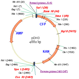 Plamid pDH3 contains the ORF for the cyan-fluorescent protein (CFP), a variant of GFP with a blue-shifted spectrum. The plasmid also contains the Kan selectable marker encoding resistance to the antibiotic G418. The codons have not been optimized for mammalian expression and instead are the same as in the parent vector (except for the 6 mutations listed below). Forward and reverse primers refer to the sequence of the primers described on the protocol page "Fusing GFP to the Carboxy Terminus of Your Favorite Protein." Some common restriction enzyme sites are shown. Unique sites are in red.