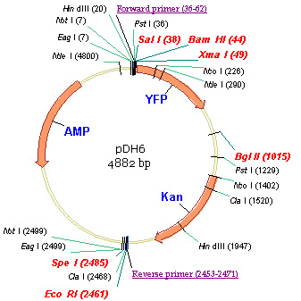 Plasmid pDH6 is built from pDH3 and pDH5. Forward and reverse