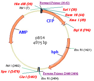 Plasmid pBS10 is based upon pBS4, where CFP has been