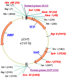 Plasmid pDH5 contains the ORF for a pH-tolerant yellow-fluorescent protein (YFP), a variant of GFP. The plasmid also contains the selectable marker from S. pombe that complements S. cerevisiae his3. The codons have not been optimized for mammalian expression; instead the codons are the same as in the parent vector (except for the 5 mutations listed below). Forward and reverse primers refer to the sequence of the primers described on the protocol page "Fusing GFP to the Carboxy Terminus of Your Favorite Protein." Some common restriction enzyme sites are shown. Unique sites are in red. His5 is from S. pombe and complements His3 in S. cerevisiae.