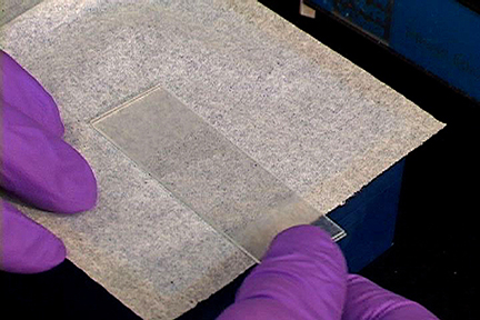 At this time a second slide, also cleaned with a kimwipe, is placed on top of the taped slide. Scotch Tape is 62.5 nm thick and so the agarose forms a pad of similar thickness. The slide sandwich is then placed on a -20 C block that was just removed from a freezer and covered with a kimwipe. The agarose is allowed to harden on the block for between 50-60 seconds, depending on exactly how long the block is out of the freezer before one lays down the slide. The key is to harden the agarose, but not to let it freeze. If it freezes just throw the pad out, as freezing leads to high background in the images.