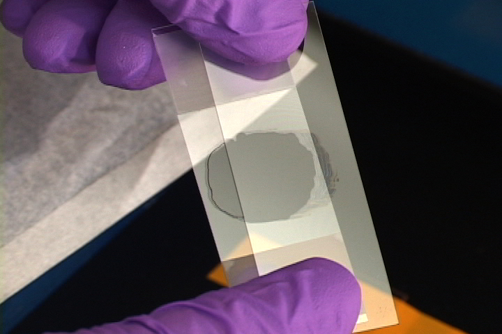 Oreo cookie and get to the yummy filling. Except here one uses a constant, gentle sliding action. The pad usually sticks to one slide or the other. If you are preparing multiple slides, then use a kimwipe to clean the slide without the pad. This slide will bind the pad on the next try. The technique can be frustrating at first, as the pad is fragile and can easily be ripped apart. After awhile you can expect 95% success rate.
