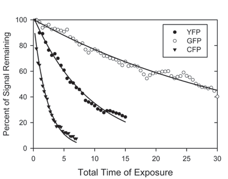 Before proceeding with our general acquisition parameters several properties of YFP and CFP need to be introduced. First, CFP and YFP photobleach much more rapidly than GFP. After six repetitions of 0.25 second exposures (a total of just 1.5 seconds!) CFP fluorescence is reduced 50%. YFP is more stable, as it takes 6.5 seconds of total exposure to diminish the signal intensity to 50%. The rapid photobleaching of CFP requires that exposure times be kept to a minimum. In practice we have found that in FRET experiments 0.4 second exposure times are optimum. The only exception is for very bright signals where the exposure times can be reduced further. The other practical point is that fluorescence is never examined by eye before acquisition by the camera.