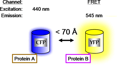 To examine FRET between two tagged proteins CFP is excited with CFP excitation filter and the emission from YFP is captured using the YFP emission filter. We call this filter combination the FRET channel.