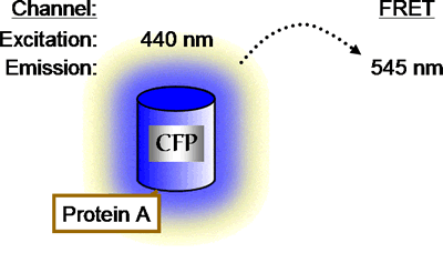 There are two problems that are encountered when using CFP and YFP as FRET partners. First the FRET channel is polluted with fluorescence spilling over from CFP. Even when CFP is expressed alone a certain amount of fluorescence is observed in the FRET channel.