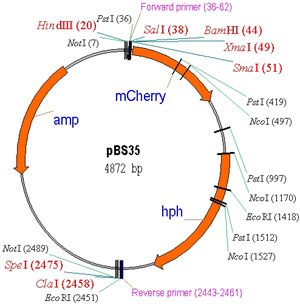 The DNA sequence of pBS35 is shown below with the mCherry sequence in red.